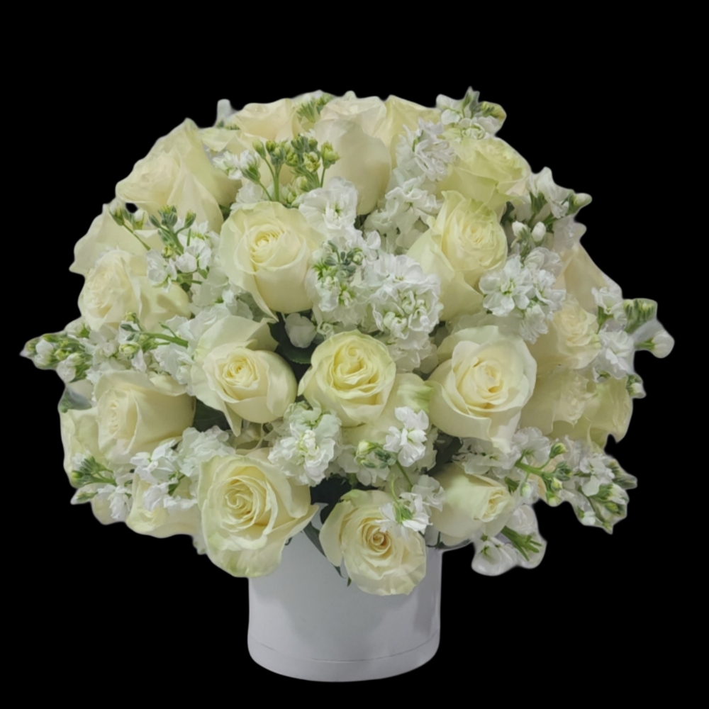 50 rosas blancas aproximadamente y alhelies blancos. 40cm diámetro