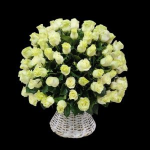 Elegante arreglo floral para funeral con 75 rosas blancas en canasto artesanal. 55cm x 50cm